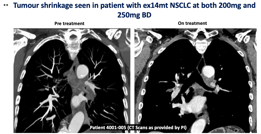 Treatment of MET exon 14 skipping mutant NSCLC patient with DO-1 resulted in significant tumour volume reduction and clinical benefit.